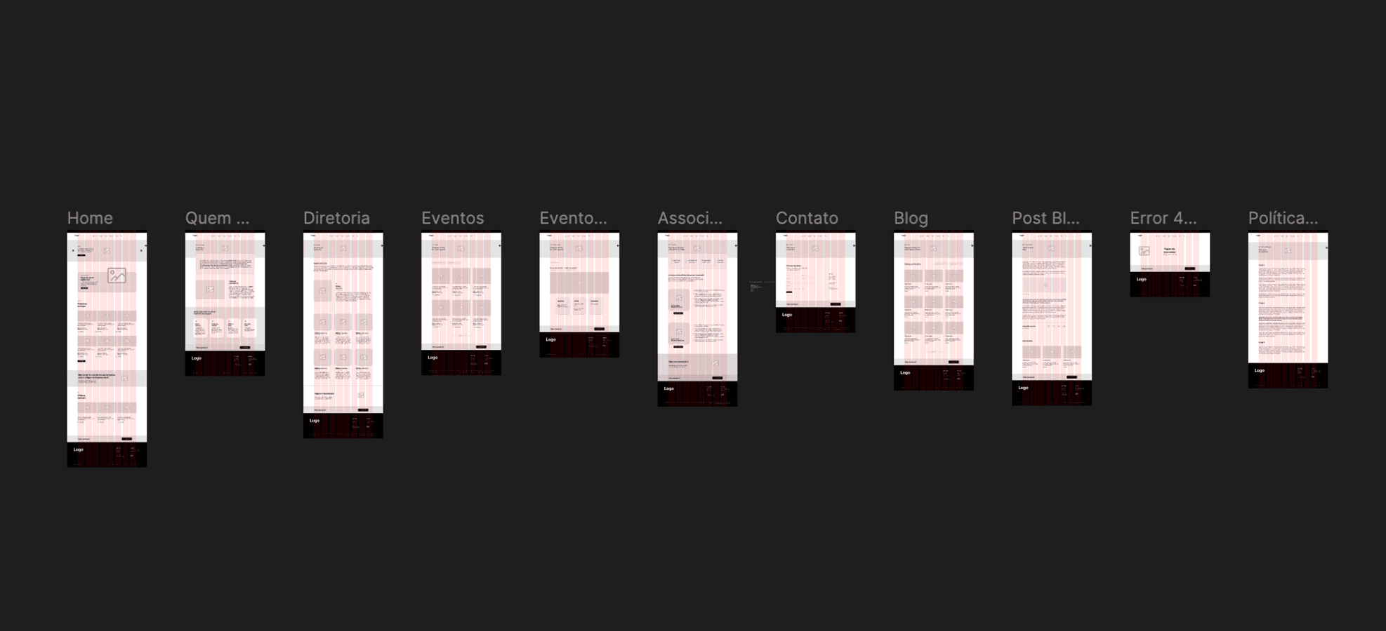 As páginas essenciais do site incluem Home, Quem Somos, Diretores, Eventos Atuais e Futuros, Associados, e Blog. Cada página foi cuidadosamente estruturada para fornecer informações relevantes de maneira organizada e acessível.